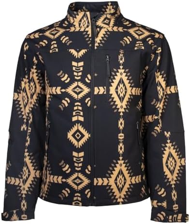 This ultra-soft, fleece-lined Hooey softshell jacket in black/tan with an Aztec pattern provides excellent wind protection and water resistance, making it ideal for cool or cold weather. Its durability allows you to combat wind and rain, while multifunctional hidden pockets and a headphone holster offer convenience. Made with 96% Polyester and 4% Polyurethane, this casual jacket is perfect for everyday wear. It features a Hooey Ride-Tight adjustable waistband, Velcro adjustable cuffs, and a standard fit.