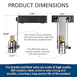 Pool water leveler auto fill : 304 stainless steel float valve and lifting frame, Weight box made of UV resistant ABS material,brass 3/4 thread adapter,pool sentry is resistant sturdy, light fastness, and not easily rusted or deformed Convenient : Simply follow the instructions for installing the automatic pool filler. Fill the counterweight box with stones, Bottom anti slip.There are sealing gaskets and filter screens at the connection of the water float valve to ensure that the pool is not blocked or leaking during automatic filling Pool auto fill float valve : The range of water level height can be set to 2 "-9". Stop water injection when the water level control float valve reaches the set height. Attention: If your water pressure is above 60psi, you will need a pressure regulator Wide applicability : Float valve with garden hose adapter, suitable for garden hoses with 3/4 inch male or female threaded interfaces, suitable for home swimming pools, public swimming pools, SPA swimming pools, fish ponds, ponds, etc After sales service : Please check the product function after receiving the Pool Auto Fill Float Valve. If you encounter any problems during use, please contact us and we will reply to you within 24 hours