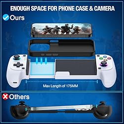Colorful Lighting & Upgraded Joysticks: Mocagen mobile gaming controller provide multi-color changing aperture. These iphone controller for gaming buttons create your own exclusive gaming atmosphere. The hall joysticks of mobile controller do not drift, not wear, also have no dead zones, long life. Easy to execute precise movements during gameplay Supported Phone Case & Camera: Perfect solution to the phone camera bulge problem with Mocagen phone game controller. You don't need to remove your phone case every time. The extra large adjustable stretch(4-7inch) on the left side of iphone controller allows you to easily fit the case along with your phone into the center mounting area Turbo Function & Vibration Function: The controller for iphone has three speeds: 5/12/20 times per second. Turbo + up/right/down adjustment for your games. Long press the TURBO button for 5S to clear all buttons TURBO function. Dual motor vibration for the ultimate mobile gaming experience. Note: L2 , R2 are not analog triggers Wireless Cell Phone Game Controller: Phone controller works with Android and iPhone devices including iPhone 17/16 series. Press and hold the "B+HOME" button together on the android phone game controller to connect your phone via bluetooth(make sure the phone controller is not in charging before bluetooth connection) Long Play Time : Our game controller grip has a built-in 600mAh recyclable rechargeable battery, the product can be quickly fully charged within 2 hours, allowing you to play games without interruption (because it is wirelessly connected to the cell phone device, it does not support charging the cell phone directly, so it won't damage the cell phone's charging port)