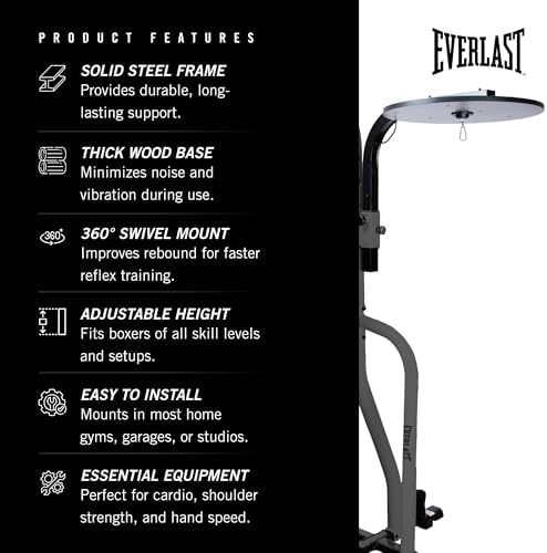 Everlast AdjTake your training to the next level with the Everlast Adjustable Speed Bag Platform—an essential piece of boxing equipment designed to sharpen reflexes, build endurance, and improve punching speed. Built from high-quality steel and finished with a thick wooden base, this speed bag mount ensures solid construction and reduced vibration during intense training. The 360° speed bag swivel adds fluid movement for precision punching and cardio conditioning. Ideal for boxers, fitness enthusiasts, or anyone looking to add a speed bag stand to their home gym. Simple to install and height-adjustable for all users. Whether you're hitting the speedbag for agility or just want a high-performance speed bag platform, this unit delivers unbeatable value. Bag not included. ustable speedbag platform