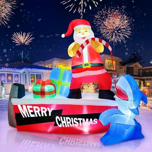- Festive Santa & Shark Design: Bring a playful twist to your holiday with this funny Christmas inflatable featuring Santa fishing a cheerful shark from a red holiday boat. Aboard the deck sit wrapped gift boxes and a bold “MERRY CHRISTMAS” sign. This charming Santa inflatable outdoor adds standout flair to your Christmas yard inflatables collection.