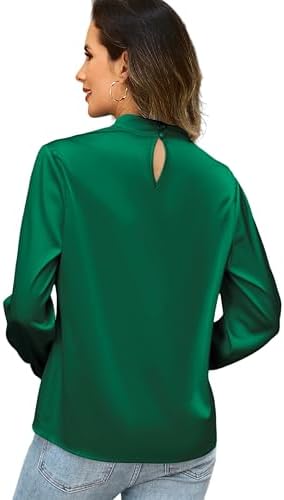 Neweek Silk Blouses for Women Long Sleeve Mock Neck Pleated Satin Business Casual Work Tops Shirts, Green, X-Small