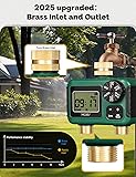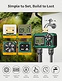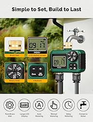 【Dual Independent Programmable Zones】This sprinkler timer features two separate outlets, allowing each zone to be independently programmed with customizable watering times, frequencies, and durations. It efficiently meets the irrigation needs of different plants and lawns, ensuring even watering and optimal hydration. 【Durable Brass Inlet, Outlet & Leak-Proof Design】Designed with a reinforced brass inlet, this timer provides superior leak resistance, durability, and corrosion protection. Unlike plastic inlets, brass ensures long-lasting performance in various weather conditions, making it a reliable choice for long-term use. 【Silicone Potting Technology – Ultimate Protection for Durability】 Our advanced silicone potting technology ensures superior waterproofing, shock resistance, and longevity for the internal components of the water valve. The high-quality silicone encapsulation creates a fully sealed barrier, preventing moisture, dust, and external contaminants from compromising performance 【Smart Rain Delay Function】 The built-in rain delay mode automatically pauses watering schedules based on weather conditions, preventing overwatering and helping you conserve water while promoting plant health. 【Manual Watering Mode & Easy Operation】 The manual mode allows instant watering without disrupting preset programs, providing extra flexibility for immediate irrigation needs. A large LCD screen and user-friendly control panel ensure intuitive and hassle-free operation. 【Wide Compatibility & Easy Installation】Compatible with gardens, lawns, greenhouses, and hose systems, this timer easily connects to standard 3/4-inch faucets. No special tools are required for installation, making it an excellent choice for both home gardeners and professional landscapers. Backed by 3 years of product support, ensuring long-term performance and customer satisfaction.