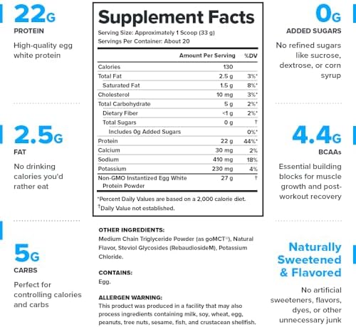 - Fuel Strength & Recovery: Each serving of our egg protein powder includes 9g of essential amino acids and 4.4g of BCAAs to help maximize muscle growth, enhance recovery, and maintain lean muscle mass.