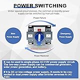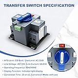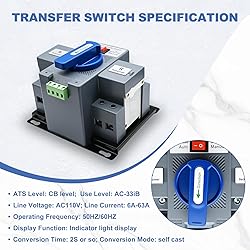 【Superior Performance Specifications】2P 63A 110V ATS. Insulated for AC110V, supports line currents from 6A to 63A, and is compatible with 50HZ/60HZ frequencies. With a rapid conversion time of approximately 2 seconds, it ensures uninterrupted power supply, maintaining electrical continuity. 【Dual-Mode Intelligent Operation】Dual Power Automatic Transfer Switch: offers both automatic and manual switching modes for flexible and reliable control. When detecting anomalies in the primary or backup power sources (monitoring only Phase A voltage for voltage loss or phase loss), it automatically and seamlessly transfers load circuits, guaranteeing stable power for connected devices. The manual mode provides an emergency fallback for enhanced adaptability. 【Comprehensive Safety Protection】Equipped with multiple safeguards against short circuits, overloads, phase failures, and undervoltage. These features form a robust protective barrier, minimizing electrical risks and safeguarding both equipment and personnel. 【Effortless Installation】Designed with a compact, space-saving structure and a durable, high-quality protective cover. The package includes detailed installation instructions, enabling hassle-free setup even for users without professional expertise. This significantly reduces installation time and costs. 【Versatile Applications】This Automatic Transfer Switch is suitable for a wide range of environments, including homes, hospitals, and offices. It excels in critical settings like office buildings and public spaces, especially those with fire safety requirements. Ideal for diverse power backup needs, it’s the go-to choice for reliable power conversion.