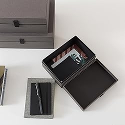 - Elevate your organization with Soul & Lane's decorative cardboard storage boxes, combining sophisticated style with practical storage solutions. This set of three decorative boxes for home decor features a premium textured graphite grey finish with sleek black accents that complement any décor while providing essential protection for your valued items. The cardboard storage boxes with lids measure 11.8"×9.1"×4.7", 10.2"×7.5"×4.3", and 8.5"×5.7"×3.9", creating the perfect decorative nesting boxes system for efficient storage and elegant display. These stackable decorative boxes provide versatile storage for photos, documents, keepsakes, and everyday items while maintaining a refined aesthetic that enhances your space. The decor boxes for shelves design allows them to be displayed prominently as decorative elements that contribute to your interior style. Each decorative photo boxes container features a practical tab closure that secures contents while maintaining the sleek appearance. The cardboard decorative boxes with lids construction offers durability and lightweight handling, making them perfect for both daily access and long-term photo boxes storage with lids needs. The versatile decorative nesting boxes with lids set works beautifully in various settings from sophisticated living rooms to organized home offices. Their neutral graphite coloring blends seamlessly with most color schemes while adding subtle texture and dimension to your space. These nesting storage boxes can be used individually throughout your home or stacked as an eye-catching storage solution on shelves, side tables, or in closets. The textured finish elevates the appearance of ordinary cardboard boxes to sophisticated storage accessories that organize your life while enhancing your décor.