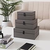 DECORATIVE STORAGE BOXES WITH LIDS: This elegant set includes three textured graphite grey boxes measuring 11.8" x 9.1" x 4.7", 10.2" x 7.5" x 4.3", and 8.5" x 5.7" x 3.9". Each box features black trim and a sleek tab closure for secure storage. DECORATIVE STORAGE BOXES: The rich textured finish creates a look that enhances any space while providing practical organization. These decorative boxes with lids combine timeless style with functionality for both visible and hidden storage needs. PHOTO BOXES STORAGE: These spacious containers are perfect for preserving photographs, documents, and memorabilia. The decorative boxes for storage design protects contents from dust and damage while maintaining an elegant aesthetic. DECORATIVE BOX SET: The nested sizes create a cohesive stackable set that maximizes storage. This keepsake boxes with lids collection offers graduated storage options that work beautifully individually or as display of a memory box for keepsakes. DECORATIVE BOXES WITH LIDS FOR HOME DECOR: The neutral finish complements various décor styles while the cardboard storage boxes construction ensures durability. These versatile containers enhance shelves, desks, and closets with organized elegance.