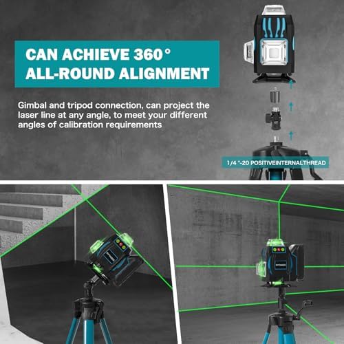 - 4x360° Laser Full Layout: Our laser level with tripod provides four 360° laser planes. It can provide complete coverage of the entire room, complete with a visual square layout. Comes with 2 x 2000mAh rechargeable batteries with up to 8 -10 hours of operating time.