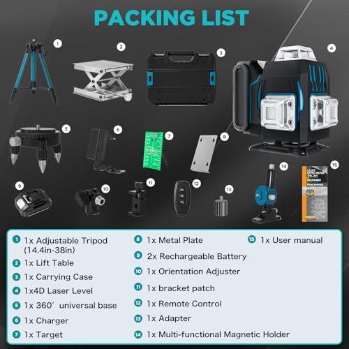 - Packing List: 1x 16-line laser level, 1x tripod, 2x removable lithium-ion batteries, 1x charger, 1x remote control, 1x shaped magnetic bracket, 1x wall plate, 1x 360 ° free rotating base, 1x direction adjuster, 1x elevation base, 1x target, 1x bracket patch, 1x 3/8 “adapter, 1x user's manual, 1x portable storage box