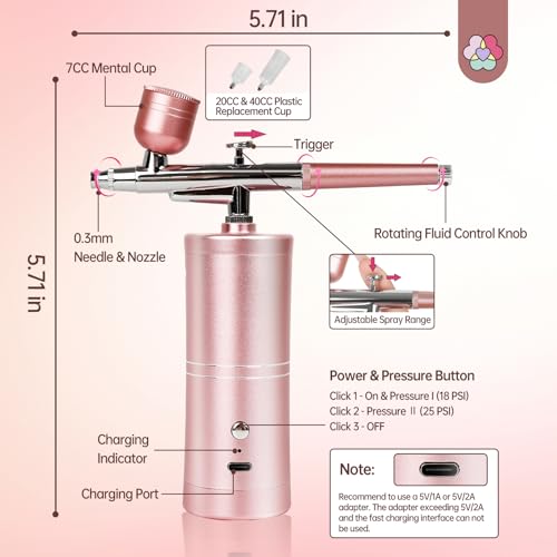 SAVILAND Salon-Grade Airbrush Kit: 25 PSI Super-Stable, Rechargeable Nail Art Machine with 0.3mm Nozzle & Dual Modes - Professional Tool for Gel Nails, Ombre & French Manicure at Home (Pink)