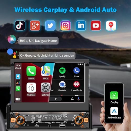 Single Din Car Radio Touchscreen (7" Motorized Flip Out) Compatible with Apple CarPlay [Wireless] Android Auto Car Stereo Bluetooth Type-C USB (3A Fast Charge) Backup Camera AUX