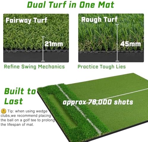 - 【Real Feel Fairway & Rough in One Mat】Enjoy dual turf in one mat—45mm rough turf for powerful driving and swing practice, and 21mm fairway turf for precise chipping and pitching drills. Simulate real-course conditions to elevate your skills at home.