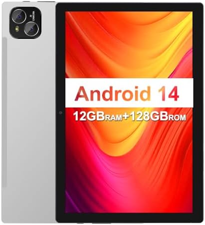 Tablet, 10 inch Android 14 Tablet, Octa-Core Processor, 12GB RAM + 128GB ROM, 1280x800 HD IPS Touchscreen, 6000mAh Battery, 2.4G/5G WiFi 6, BT 5.4, Dual Camera, Metal Body, Sliver