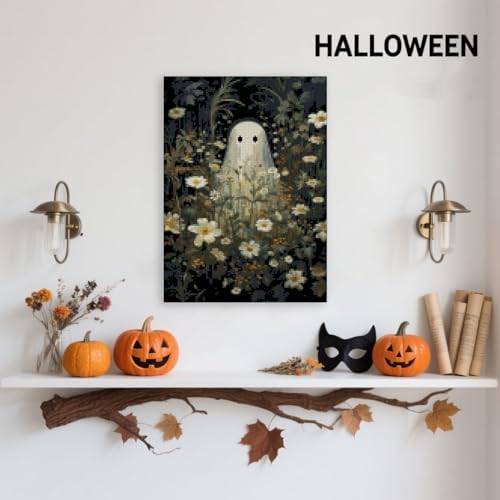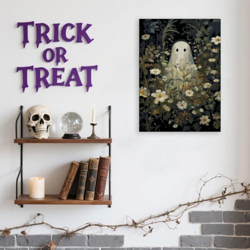 Ghost Stamped Cross Stitch Kits for Beginner, Halloween Needlepoint Counted Cross Stitch Embroidery Kits for Adults, 11CT Daisy Flowers Dimensions Counted Cross-Stitch Patterns Arts Craft Kits