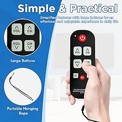 Big buttons for Seniors - This remote is designed Senior Friendly with large color-coded tactile buttons for easy use. Only 3 Functions; On/Off, Channel Up, Channel Down, Volume Up, Volume Down and Mute. It’s the perfect for gift for caregivers, elderly loved ones with Dementia or Alzheimer's or someone with low and impaired vision. With Luminous & Waterproof function, you can quickly find your remote control at night and operate it clearly Easy to Set Up - With Auto Search and Learning functions, Just turn on your TV and point the remote at the TV. Press and hold the [SET] buttons for 7 seconds. LED will lighting, Release [SET] button, When the TV is power off, press [SET] button to save the code. Universal TV Remote: Works on the most brand TV Brands. !! NOT FOR CABLE BOXES, FIRE STICK, ROKU STICK. Only for TVs. Check images for full list of compatible TV Models Package include - 1 x remote control, 1 x portable cord, 1 x user muanal. (2 x AAA batteries not include)