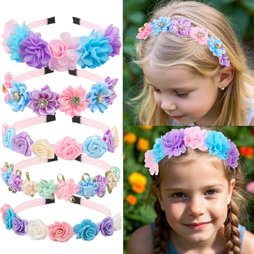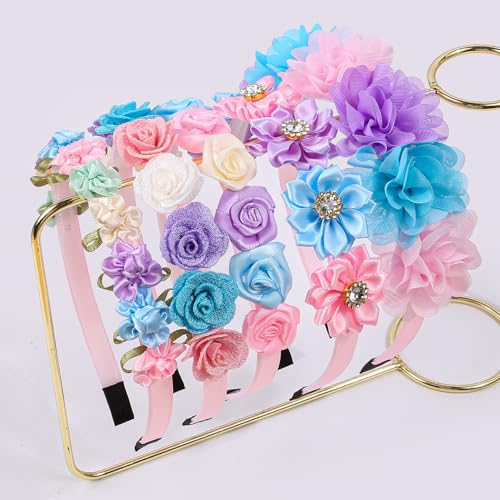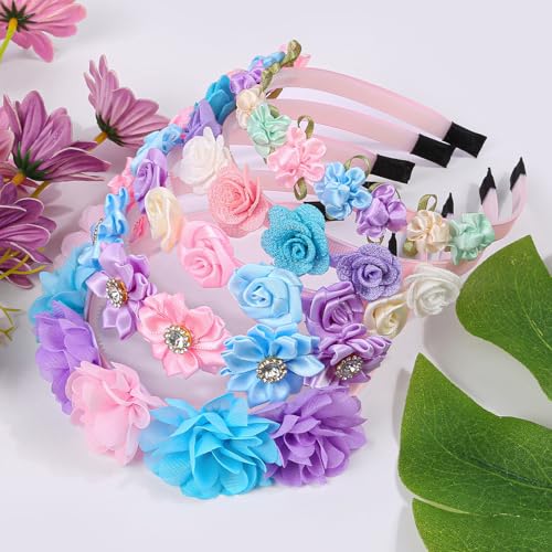 XIMA Pastel Floral Headbands for Girls,Chiffon Rose Hair Accessories with Rhinestones Flowers Hairbands for Toddlers Teens Childrens Kids Women Pack of 5