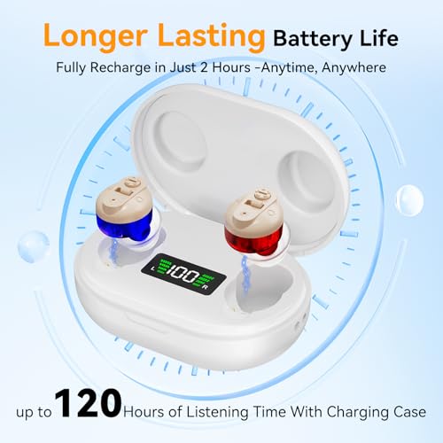 - 48-Hour Battery Life with Portable Charging Case: Never worry about running out of power. Our high-efficiency design provides up to 48 hours of use on a single 2-hour charge. The included portable charging case offers extra power on the go, ensuring your hearing aids are always ready day or night.