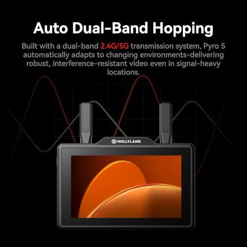 - [4K Input and Dual Band Auto Jump] - Pyro 5 monitor supports 4K video inputs, ensuring video footage is displayed with unmatched clarity. Thanks to ADH technology, it works seamlessly at 2.4GHz and 5GHz frequencies, dynamically selecting from 8 frequency points to minimize interference. The result is stable and seamless video transmission, essential for live productions and high-risk filming.