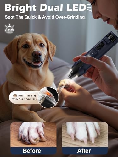 - 【Bright Dual LED for Safe, Accurate Grinding】Two built-in LED lights clearly illuminate the nail area, our electric dog nail trimmer helps you easily spot the quick and avoid over-grinding, and offer enhanced visibility from multiple angles, even for dark and thick nails or low-light conditions