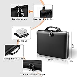 Ultimate Fireproof & Water-Resistant Protection:The hard shell fireproof document box made of thickened silicone coated fireproof heat insulated cotton material and hard-shell material that resists fire and passes the SGS TEST(UL-94 VTM-0 Burning Test) , burning test and with stands up to 2200°F. The fireproof file organizer is both fireproof and water-resistant, ensuring that your valuable materials, important documents are protected from fires, floods, or wet weather. It may fit both letter and legal-size files. Upgraded Hard-Shell Design Fireproof File Box: Our fireproof file box merges a hard-shell structure with fireproof materials for superior protection and durability. Unlike traditional soft bag, it remains indestructible under extreme conditions and maintains a stylish, professional look. Its dust-proof material effectively blocks dust, hair, and stains, keeping the box clean and tidy for years. It’s the ultimate choice for safeguarding important documents, laptops, and valuables. Portable & Lightweight:Our fireproof document box, measuring 14.8" × 10.7" × 2.4", is much more portable and lightweight than larger fireproof boxes on the market. It features a multi-tier design with 13 accordion pockets, 16 card slots, 2 small mesh bags, 2 mesh bags, 1 pocket, and 1 main pocket. This design allows it to store important documents, money, passports, USB drives, cards, ID cards, laptops, certificates, and books safely and neatly. It is perfect for daily document management and storage. Removable Independent Combination Lock: This fire proof file box comes with a detachable combination lock (no keys needed!), making it both secure and super convenient. Just lock it up when you need to, or toss the lock inside when you don’t. It waterproof dual metal zippers that glide effortlessly and resist high-pressure hose spray. The sturdy leather handle makes it easy to carry around. Perfect for business, travel, the office, school, or home—it keeps your important documents safe and sound. Trusted After Sales Service: If you are worried about your valuable documentos being destroyed by fire, or your documents are messy, it will be a good helper to protect your valuable documents. Not only can you put it in your home, office, car, safe, locker and cabinet, but you can also take it to traveling. Compared to traditional safes, it's lighter, easier to carry, and can be taken anywhere. If there are any quality issues, please contact us immediately—we are committed to resolving issues promptly.