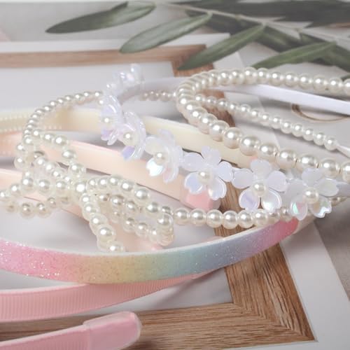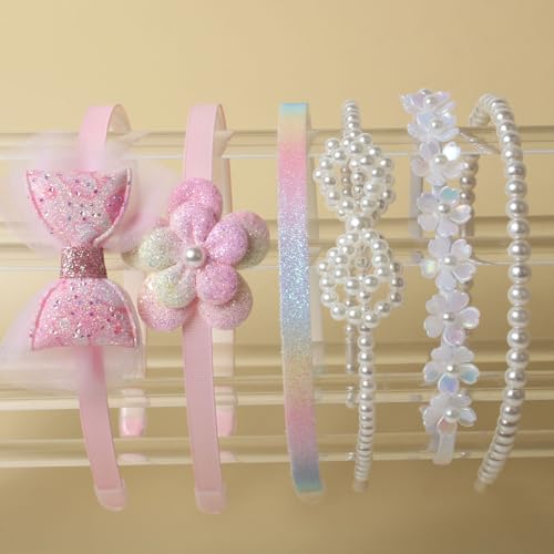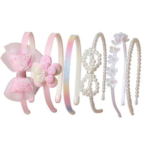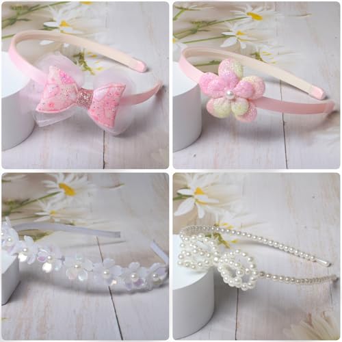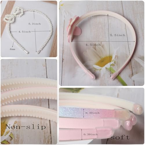 - Hair Bands Package: The package consists of 6 different design headbands,pink bow headbands,pink flower headbands,Glitter ombre headband,bow pearl headband,white flower headband and bead headband various styles meet daily replacement needs and matching requirement, the set fits different outfits on different occasions hair accessories