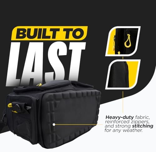 - RUGGED, WATER-RESISTANT CONSTRUCTION – Crafted with durable 420D ripstop nylon and a dual-layer water-resistant coating, this fishing bag protects your tackle from rain, splashes, and spills. The molded compression bottom grips to any surface and keeps your gear elevated from standing water.