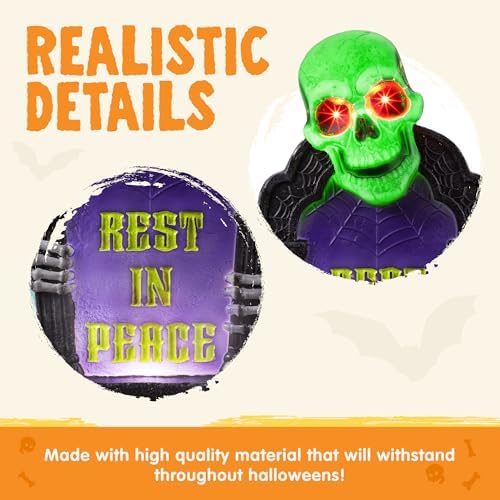 - Multi-Color LED Lights: The skull glows with an eerie green light, while its eyes pierce the darkness with red LEDs, and the tombstone radiates a ghostly cold white light—all designed to stay illuminated for haunting ambiance. Be ready to use them to guide trick-or-treaters to your door and create a creepy atmosphere in your haunted yard.