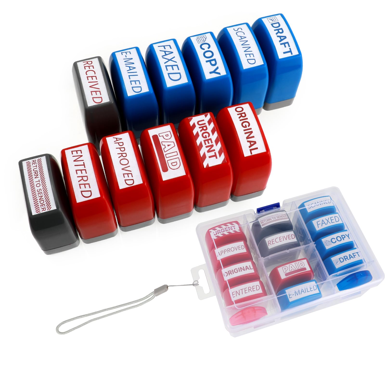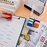 Self-Contained 6-Pack Stamp Set for Streamlined Workflow: Maximize efficiency with 6 pre-inked self-inking stamps: 3 in vivid red for execute final judgments (CANCELLED, ORIGINAL, APPROVED) and 3 in professional blue for certify transmissions (COPY, FAXED, SCANNED). Eliminate manual writing on documents, records, and communications — save 5+ seconds per stamp vs traditional methods. Ideal for high-volume finance, admin, and clerical work. Durable Rubber Seals & Refillable Photo-Sensitive Ink System: Constructed with rubber for extended serive time. Each fully saturated ink chamber delivers 200+ crisp impressions (add 10+ drops of exclusive photo-sensitive ink). Refillable design supports 10,000+ lifetime uses. Snap-lock base caps seal ink from drying or leakage. CAUTION: Regular ink voids warranty! Ergonomic Mini Size + Organization-Ready Packaging: Individual stamp size (2.08×1.73×0.88 inch) fits in pockets, storage tray (4.13×4.13×2.6 inch) slots into bags. Includes free hanging strap for vertical desk/toolbox mounting. Top-labeled caps + test-print card guarantee instant phrase matching — no fumbling mid-task! Dual-Color Ink System, Precision Engineered for Compliance Use: Red ink certifies finality (CANCELLED/ORIGINAL/APPROVED), blue ink validates transmissions (COPY/FAXED/SCANNED). Self-contained ink chambers deliver one-click 0.3s impressions — zero smudging on 20-24 lb paper. Refill with photo-sensitive ink only. Each stamp set sealed with oxygen-blocking film preventing ink drying during shipping/storage. Cross Departmental Document Control Expert: From Desks to Audit Rooms. Dominate document flows in: Legal: CERTIFY originals (ORIGINAL) & void files (CANCELLED) Finance: Approve payments (APPROVED) & archive copies (COPY) Compliance: Transfer status (FAXED/SCANNED) Hang the color-coded kit via strap on file carts — seamlessly shift between mailroom, accounting, and legal departments. Managers: cut approval delays 60% with instant stamp authorization!