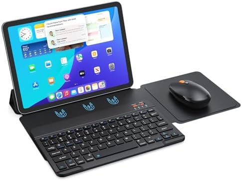 - 【Ultra-thin and Lightweight Design】The keyboard and mouse for iPad are compact enough to carry around. The iPad keyboard case can store the keyboard and mouse, folding like a book, and does not take up too much space. Its ultra-compact design allows it to be easily stored in backpacks/briefcases, making it the perfect mini wireless keyboard mouse for students on the go and business professionals. Size: 9.75 x 5.91 x 0.28inch, weight: 19.11ounce/1.19pounds.
