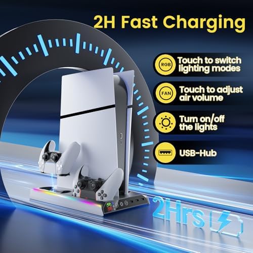 PS5/PS5 Slim/Pro Stand with Adjustable Cooling Fan, PS5 Cooling Stand for PS5/PS5 Slim/Pro, PS5 Cooling Station with Dual Controller Chargers and RGB Light for PlayStation Vita Skins