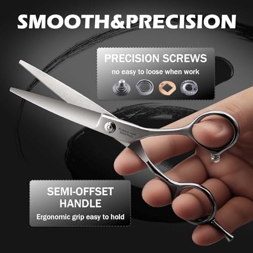 • 【Ergonomic Design for Beginners & Pros】Specifically engineered for novice barbers, the 6" semi-offset handle reduces wrist strain. With rubber inserts and an adjustable tension screw, these hair scissors for beginners offer salon-grade comfort for extended use. Lightweight (50g) and balanced for all hand sizes.