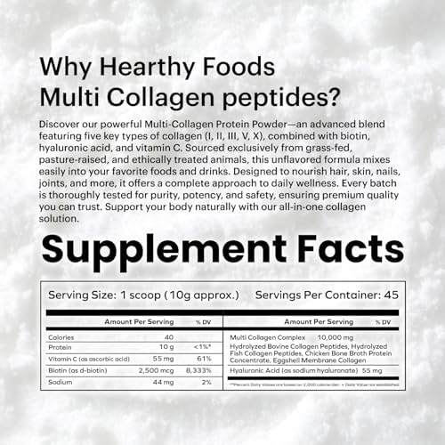 Rejuvenate from the inside out with Hearthy Foods Multi-Collagen Protein Powder. This premium blend combines five essential collagen types—Type I, II, III, V, and X—sourced exclusively from grass-fed, pasture-raised animals that are Halal- and Kosher-certified. Enriched with biotin, hyaluronic acid, and vitamin C, it supports radiant skin, stronger nails, healthy hair, joint comfort, and gut health—helping you feel and look your best daily. With 45 servings per bag, this unflavored formula mixes effortlessly into coffee, tea, smoothies, soups, and baked goods without altering the taste or texture. Whether you’re starting your morning or recovering after a workout, it’s the perfect daily boost for your wellness routine. Every batch undergoes rigorous third-party testing to ensure purity, potency, and safety—free from GMOs, artificial additives, gluten, soy, and dairy. Why choose Hearthy Foods? Because we believe your supplements should be as clean, ethical, and effective as the food on your table.