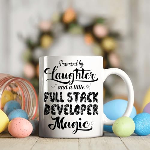 Full Stack Developer Mug - Powered by Laughter and a Little Full Stack Developer Magic - 11oz White Ceramic Coffee Cup - Gift for Full Stack Developer, Office, Coworkers, Birthday, Christmas