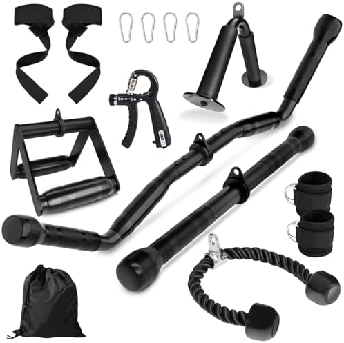 - Lat Pulldown Attachments Set:Combo includes 1x tricep rope, 1x V-handle (Double D Handle), 1x V-shaped bar, 1x straight rotating bar, 1x lat pull down bar, 1x hand gripper, 2x lifting wrist straps, 2x ankle straps, 2x cable machine handles, 4x snap hooks and storage bag. These home gym accessories for men and women are designed to fit most cable systems
