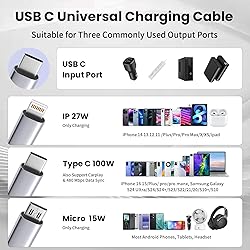 - [3 IN 1 Charging Cable]: This usbc multi charging cable integrates three different output ports in one single cable including USB C /Type-C, IP/Lightning, and Micro USB. The charging cables for multiple devices is compatible with most of all electronic devices in daily life and is able to charge three different devices at the same time, making the phone charger simple, lightweight and portable. (Pls NOTE: only the Type C port supports data transfer and Carplay function, while the IP/Lightning and Micro USB ports JUST FOR CHARGING!!!) [100W Fast Charging Cable] Featuring the 6-core thickened tinned copper and the E-mark chip, Our usb c multi charging cable enables super-fast charging up to 100W (USB C to USB C port), while the USB C to Lightning port delivers up to 27W and USB C to Micro delivers up to 15W. Please note, multiple charger cord super fast charging requires your device support fast charging and a 30W or above power adapter. [Extreme Durability and Safety]: Our usb c to multiple connectors multi charging cable have various protection features: the * E-Mark Chip* prevents damage from overcurrent and overvoltage, the internal *Tinned Copper Core* makes charging more stable, the outside flexible *Nylon Braided Sheath* and sturdy *Aluminum Alloy Connectors* provide enough durability for abrasion. These greatly improve the lifespan of the charging cords for multiple devices and provide safety for your daily charging use! [Universal Compatibility]: The 3 in 1 fast charging cable is usb c to multiple connectors, which can meet most of your daily charging need. ●Type C port: Almost Type-C Port Android phones such as Sam-sung Galaxy UItra S24 s23 s22 s21 s20 s10 s9 s8 s7 s6 s5 Note 10 9 8, Huawei, HTC, LG, Sony Xperia, Google Pixel, Moto; iPhone 16/15 Series. ●The Micro USB port: Most Android and Windows phones, tablets and many other devices.●The IP connector can be use for iphone 14/13/12 and more. [5FT Reasonable length & Portable Design]: This 5 feet long multi charger cable allows you to comfortably use your device while charging in many scenarios in your life. You can charge your several devices simultaneously at home or in the office, and our universal charging cable is also convenient to take when you go out and need a travel charger for multiple devices to share with your friends. [From the Brand]: Firsting has been committed to the data cable industry since its inception in 2010, we have our own data cable factory in China with a professional technical R&D team and quality control department.