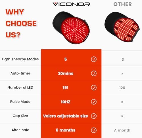 - Customizable Home Therapy Sessions: Viconor cap features four steady light modes plus a 10Hz pulse mode, controllable via a user-friendly controller for personalized 0-30 minute sessions. Wear it comfortably for 30 minutes, 3-5 times a week to achieve optimal results. The cap's automatic shut-off ensures a convenient and effective therapy experience during work, relaxation, or even light exercise.