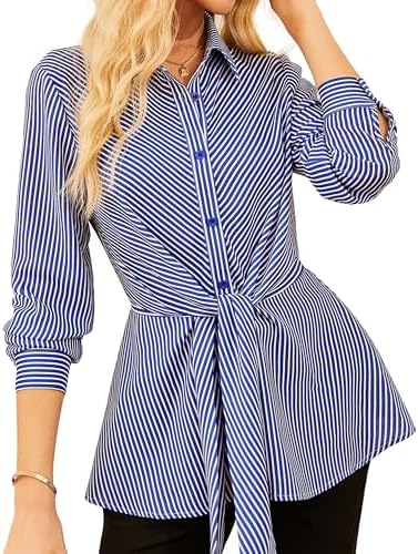 GRACE KARIN Peplum Tops for Women Tie Front Striped Button Down Shirt Collared Long Sleeve Business Casual Work Office Blouse