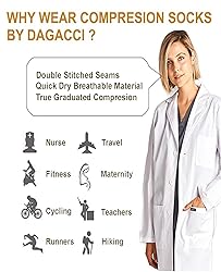 - Dagacci Medical Uniform's Compression Socks with Graduated Compression Fabric and Quick Dry Breathable materials. 95% polyester and 5% spandex provide form fitting and stretchy sock.
