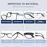【No-line Trifocal Readers】-Progressive reading glasses men features multifocus lenses with 3 different visions.These are ideal for long term desk work,allowing smooth switching between interaction,screen use,and reading.The bottom offers full power for reading and writing,the middle part is slightly reduced power magnification for working on a computer and the top part is half power magnification for interacting,but not close reading.If you're new to these readers,adjustment may take some time 【Stylish and Sporty Design】-1 pairs progressive readers are packed with 1 case and 1 cleaning cloth.Then,the eyeglasses combine classic frame shape with metallic two-tone colour paiting on the temple,fully expressing sporty and personality style,both suitable for casual and business occasion.You will stand out from the crowd when wearing it 【Blue Light Blocking Lens】-Blue light reading glasses lens with UV400 protection can cut more than 99% of harmful blue ray,reduce eye strain,headache and blurred vision caused by digital device.No worry about eye fatigue during long time reading and gaming on digital screen.Let you enjoy better sleep and digital time 【Lightweight TR Frame with Adjustable Temples】-The frame are craftworkly made of light weight TR material with comfortable nose type which let you barely feel its presence on your nose.Anti-slip rubber temples prevents the frames slide off your faces.The soft tips can be bended and adjusted properly to fit your head,not easily broken.This eyewear maximize your comfort during wearing 【Product Dimension】-Lens width:52mm(2.05inch),Lens height:38mm(1.50inch),Frame width:131mm(5.16inch),Nose Bridge:18mm(0.71inch),Temple length:143mm(5.63inch)