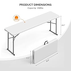 Quality and Sturdy: The skinny tabletop is made by HDPE, solid and enough thick. Features a robust and sturdy metal frame that provides a secure and stable surface for an array of activities. The strong frame is with gray coated, beautiful as well as stable Easy to Use: Overall size (70.5 x 17.7 x 29) inch; and could be folded into (35.3 x 17.7 x 3.2) inch; The slim table's innovative folding design promotes easy setup and quick breakdown. Additionally, it allows for efficient storage, making it an ideal choice for users who value space-efficiency and convenience Lock Design: The maximum weight capacity of this table is up to 350lbs. It is designed with a lock on the support rod to prevent collapse when open, ensuring safety during use No Assembly Required: This table comes fully assembled, so there's no need for any extra accessories or tools. It can be easily opened and used whenever needed Wide Applications: Offering exceptional versatility, this thin table is suitable for a wide range of indoor and outdoor settings. Whether it's for a small home office setup or for accommodating guests at outdoor gatherings, this table proves to be an adaptable and practical addition to any environment