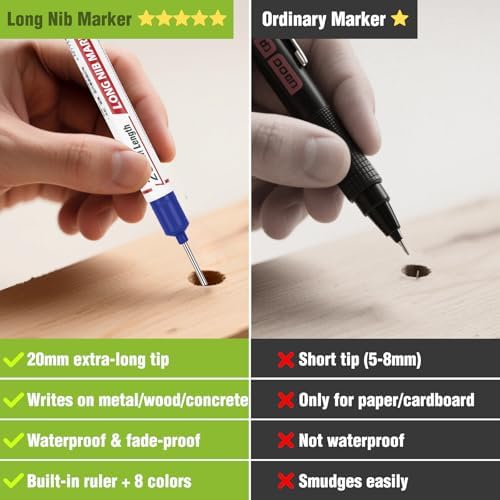 - Precision Deep Hole Marking: Engineered with an extra-long 20mm nib, our long nib marker easily reaches into deep holes, cracks, and confined spaces. Features a built-in 6cm ruler for accurate placement, making it the essential deep hole marker pen for carpenters and tough construction jobs.