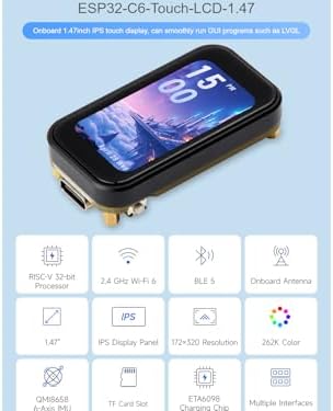 ESP32-C6 1.47inch Touch Display Development Board with pre-soldered Header, 172×320 Resolution, 262K Display Color, Supports Wi-Fi 6 / BLE 5, 160MHz RISC-V Processor Features ESP32-C6-Touch-LCD-1.47 uses ESP32-C6FH8 chip with 2.4GHz WiFi 6 and Bluetooth BLE 5 support, integrates 8MB Flash, Onboard 1.47inch IPS display can smoothly run GUI programs such as LVGL. It is suitable for the quick development of the HMI and other ESP32-C6 applications. Equipped with a high-performance 32-bit RISC-V processor with clock speed up to 160 MHz, and a low-power 32-bit RISC-V processor with clock speed up to 20MHz Supports 2.4GHz Wi-Fi 6 (802.11 ax/b/g/n) and Bluetooth 5 (LE), with onboard antenna Built-in 320KB ROM, 512KB HP SRAM, and 16KB LP SRAM, integrates 8MB Flash Onboard 1.47inch capacitive touch LCD display, 172×320 resolution, 262K color Adapting multiple IO interfaces, supports full-speed USB standard Onboard TF card slot for external TF card storage of pictures or files Supports accurate control such as flexible clock and multiple power modes to realize low power consumption in different scenarios Usage Instructions ESP32-C6-Touch-LCD-1.47-M currently provides two development tools and frameworks, Arduino IDE and ESP-IDF, providing flexible development options, you can choose the right development tool according to your project needs and personal habits. Package Content ESP32-C6-Touch-LCD-1.47 with pre-soldered header × 1 Note Development Resources is provided , please contact us if you have any problem .