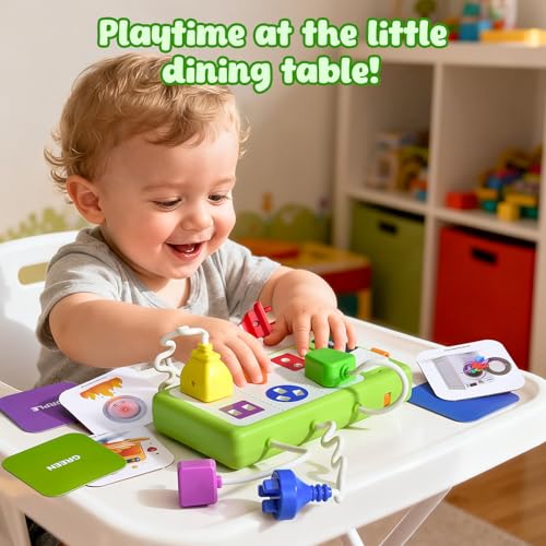 - Color-shape matching, playful songs, and realistic appliance sounds make this plug board a compact busy board for car rides and flights, delivering hands-on sensory fun whether at home or on the go