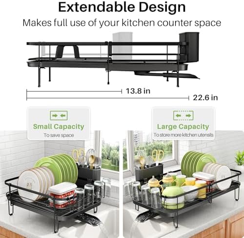 SNTD Dish Drying Rack, Expandable Dish Rack for Kitchen Counter, Metal Dish Drainer with Utensil & Cup Holder 13.8"-22.6" L x 12.1" W (Black)