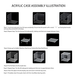 Acrylic 360° Crystal-Clear Display & Floating Design Crafted with ultra-transparent acrylic, this display case offers a distortion-free view of your collectibles from every angle. The elevated platform with golden stainless-steel feet creates a "floating" effect, adding depth and sophistication to your display. Quick Tool-Free Assembly (Under 5 Minutes) No technical skills needed! Follow the step-by-step illustrated manual to snap parts together effortlessly. Includes a round plate tool and gloves for scratch-resistant handling during setup. Adjustable Layout with Detachable Shelf Customize your showcase: Use the 4mm-thick floating shelf (8.78"Lx8.78"W) for elevated displays or remove it to accommodate taller items up to 12.89"H. Perfect for toys, figurines and memorabilia. Premium UV-Blocking Protection 3mm acrylic walls + 5mm reinforced base shield against UV rays to prevent fading. Dust-resistant sealed edges keep treasures pristine without frequent cleaning. Complete Kit with Lifetime Support Includes: Pre-cut acrylic case, floating shelf with golden feet, 4 non-slip rubber pads, microfiber cloth, assembly tools, and manual. Backed by a customer satisfaction guarantee.
