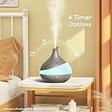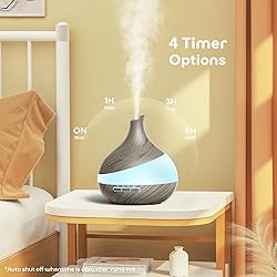 2 Mist Modes: This diffuser releases a consistent cool mist to effectively increase room humidity without making your furniture or floors damp. You can adjust between Low Mist (30ml/h) and High Mist (60ml/h) by pressing the power button, making it suitable for any room size. Large Capacity Aroma Diffuser: Our 500ml essential oil diffuser is ideal for spacious rooms. It also features 7 ambient lighting options to create a calming atmosphere and add vibrancy to your daily life. 14-Color LED Light: Our diffuser offers 7 colors with 2 lighting modes—fixed or cycling. The mist and light functions can operate independently, allowing you to turn off the light at night for sleep or use it softly as a nightlight. Remote Control: The diffuser comes with a user-friendly remote control that operates from up to 15 feet away. You can adjust lighting and mist modes, set the timer to 1/3/6 hours, or choose steady ON mode. An automatic safety switch also prevents overheating if water runs out. Low Noise for Better Sleep: Equipped with an upgraded quiet fan and noise reduction technology, the diffuser operates below 25 dB. This ensures a peaceful and soothing environment for studying, working, or resting.