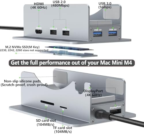 Unleash Your Mac mini M4's Full Potential! THANDBLE 9-in-1 Pro Dock End your port shortage struggle! Instantly transform into a powerhouse workstation: 9 Essential Ports: Dual USB 3.0 (5Gbps) + Dual USB 2.0 (for keyboard/mouse) + SD/TF Card Reader (104MB/s). Handle multitasking & high-speed transfers seamlessly. Dual 4K Ultra HD Output: HDMI + DisplayPort support 4K@60Hz. Perfect for meetings, design, and gaming with multi-resolution compatibility. 8TB Storage Expansion: Built-in M.2 NVMe SSD slot (2280 size). Effortlessly manage 4K editing & massive backups. Pro Design: Precision cooling + Mac-inspired aesthetics. The ultimate efficiency tool for photographers, designers & developers!