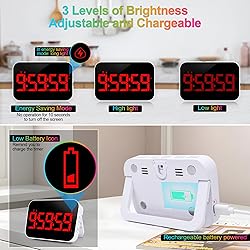 RECHARGEABLE LED DISPLAY TIMER: Our kitchen timer doesn't need additional batteries, the built-in battery supports Type-C charging (charging cable included in the package). Big and bold digits and clear large 5" LED display timer can work for at least 5 hours in Hight light mode. When the battery is low, a low battery indicator will be displayed in the upper right corner. Great for kids and seniors, you can easily make it work too MULTIPLE PLACEMENT COOKING TIMER: The digital kitchen timer for cooking with 4 strong magnets on the back, it can be easily attached directly to the refrigerator and any other metal surface, you hang it anywhere by using the hook, the magnetic timer is also equipped with a bracket on the back, push the bracket on the back two times consecutively until you hear a click and the bracket opens up completely you can put it anywhere you want 3-LEVEL VOLUME AND VIBRATION MODE: This productivity timer features 4 reminder volumes: Mute (0 dB), Medium (60-75 dB), High (80-90dB) and vibration, you can choose the volume mode according to different usage scenarios. Four reminder modes to meet the needs of different scenarios such as kitchens, classrooms, meetings, naps, games, etc. 2-LEVEL BRIGHTNESS & POWER SAVING MODE: The timer with high and low brightness and energy-saving mode adjustment, you can choose the brightness mode according to different use scenarios (Note: energy-saving mode enters the sleep state after 10 seconds) COUNTING DOWN/UP KITCHEN TIMER: The large digital timer countdown from 9:59:59 to 0:00:00, or as a stopwatch from 0:00:00 to 9:59:59, When the timer count down is over, press the ST/SP button and return to the last set time. Perfect for a variety of uses such as a kitchen cooking timer, classroom timer, workout timer, egg timer, gym timer, yoga timer, study session timer, or meditation timer MAGNETIC TIMER EASY TO USE- The visual timer for classroom with simple button settings, children and seniors can make it easily for work! Separate H, M and S buttons set the exact time you need, SP/ST buttons start/stop, a CLEAR button is added to make it easier to reset. Press and hold the H, M or S to quickly adjust to the time you want. When the countdown starts, press any of the top buttons to pause, then press the ST/SP button to return to the last set time