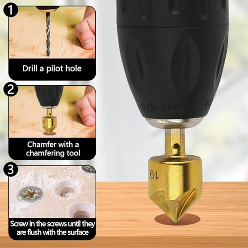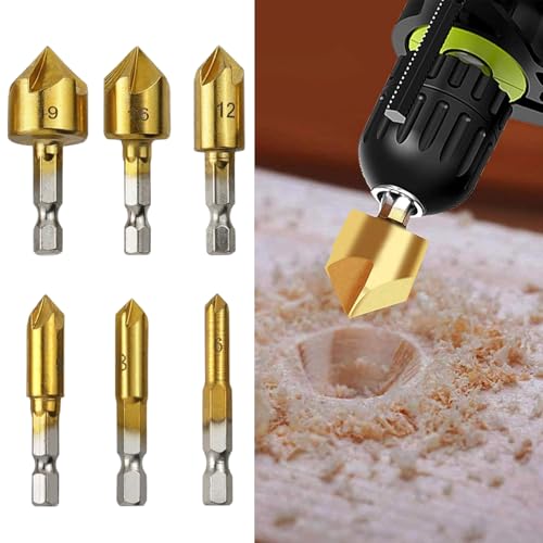Countersink Drill Bit, Set 6 Pcs 1/4'' Hex Shank HSS 5 Flute Countersink 90 Degree Center Punch Tool Sets for Quick Change Bit 6mm-19mm