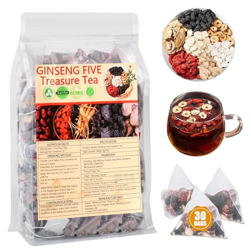- Ginseng Five Treasure Tea originated over 400 years ago. Originally, it contained only ginseng and red dates, primarily used for supporting kidney health. Later, the recipe was improved by adding three more ingredients, and the name was changed from Ginseng Tea to Ginseng Five Treasure Tea. In modern times, two additional ingredients were incorporated, resulting in the final formula consisting of ginseng, red dates, huang jing, goji berries, mulberries, cistanche, and maca. Therefore, it is now known both as Ginseng Five Treasure Tea and Ginseng Six Treasure Tea.